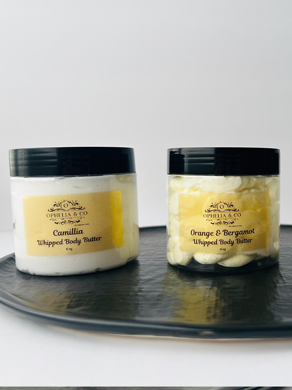 Our Whipped Body Butters are the definition of indulgent hydration. Crafted in small batches with skin-loving butters and oils, each jar melts effortlessly into the skin — delivering rich moisture without the heaviness. The whipped texture feels airy and luxurious, while the delicate scents add a touch of elegance to your daily self-care ritual.